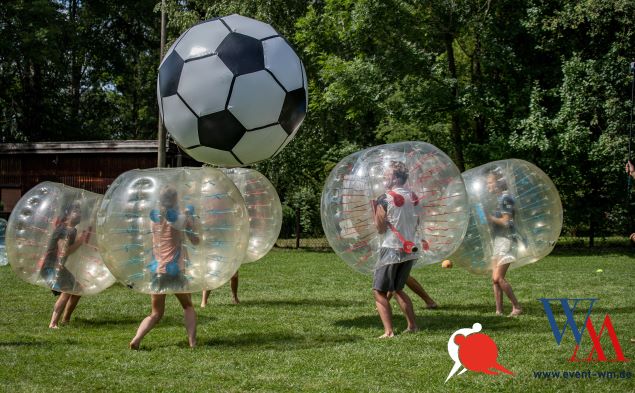 | Schubsen, rempeln, umhauen: Was im normalen Fußball zu Strafen führt, ist bei Bubble Soccer erwünscht. Denn bei dem Trendsport tragen die Spieler riesige Plastikluftblasen, die sie schützen und jede Menge Spaß bereiten. Ansonsten sind die Regeln ähnlich wie beim normalen Fußball. Der sogenannte Bubble Ball umhüllt Kopf, Oberkörper und Oberschenkel. Man muss nicht der tollste Fußballer sein um zu gewinnen. Der Teamgedanke ist am wichtigsten. Ein Team besteht aus 5 Spielern im Feld gegen 5 Spieler des Gegners. Gespielt wird ohne festen Torwart, da Hand sowieso nicht gespielt werden kann. Das Tor verteidigt die ganze Mannschaft.