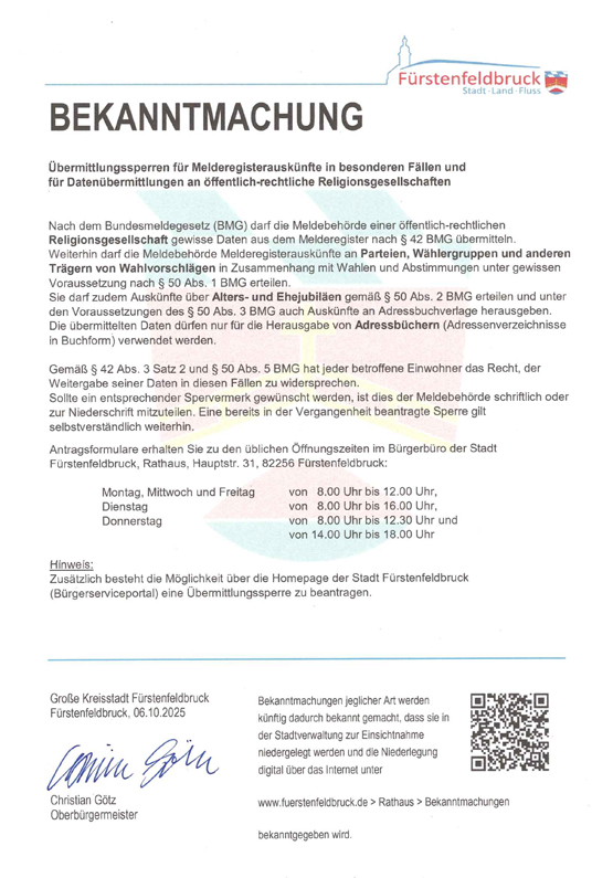 Übermittlungssperren für Melderegisterauskünfte in besonderen Fällen und für Datenübermittlungen an öffentlich-rechtliche Religionsgesellschaften