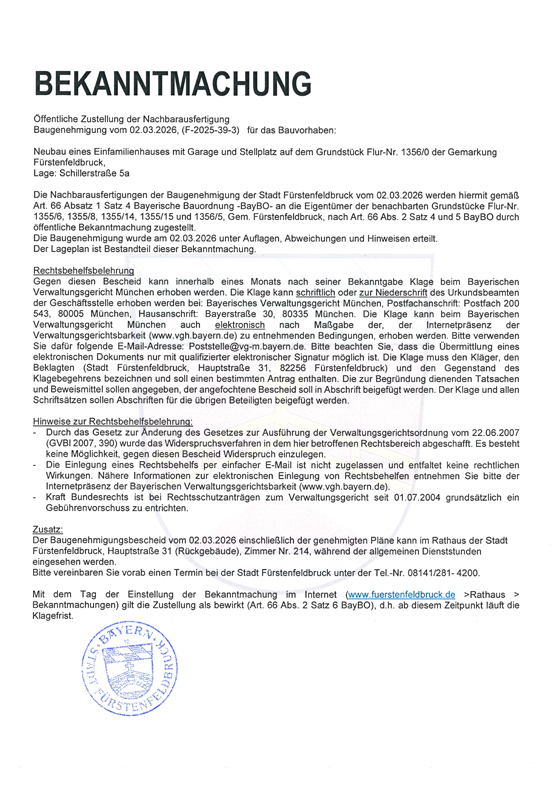 Öffentlichen Zustellung der Nachbauausfertigung F-2025-39-3 Schillerstraße 5 a