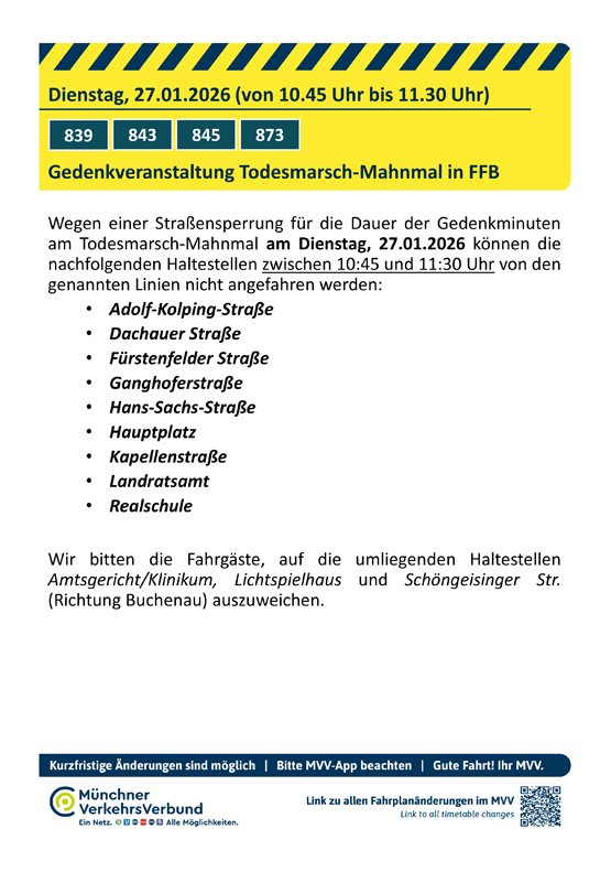 Für die Gedenkveranstaltung wird ab 10.45 Uhr bis eta 11.30 Uhr der Bereich rund um das Mahnmal für den Verkehr gesperrt.
