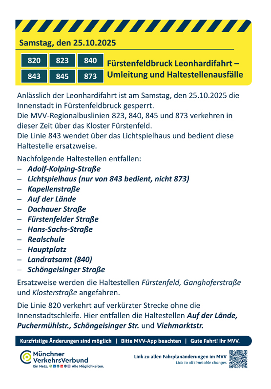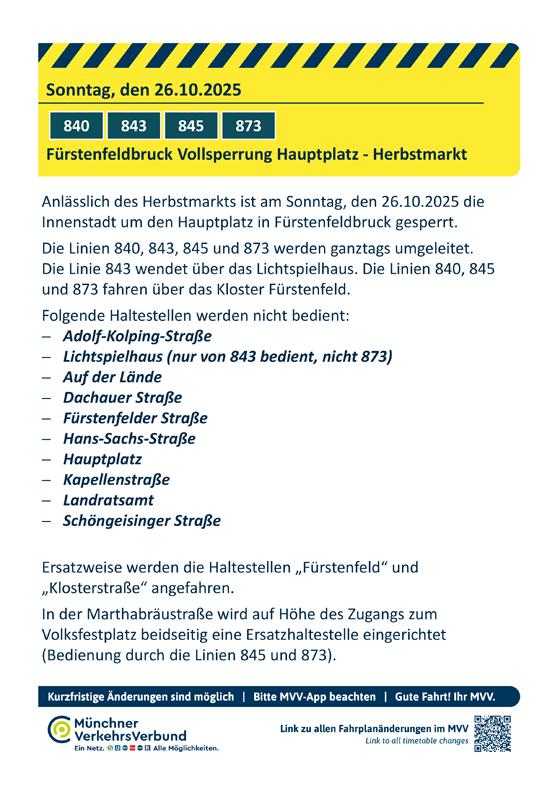 Die Haltestellen der MVV-Regionalbuslinien in dem betroffenen Bereich werden nicht bedient. Die Stadt bittet, die untenstehende Fahrgastinformationen des ÖPNV zu beachten. Weitere Informationen gibt es unter www.lra-ffb.de.