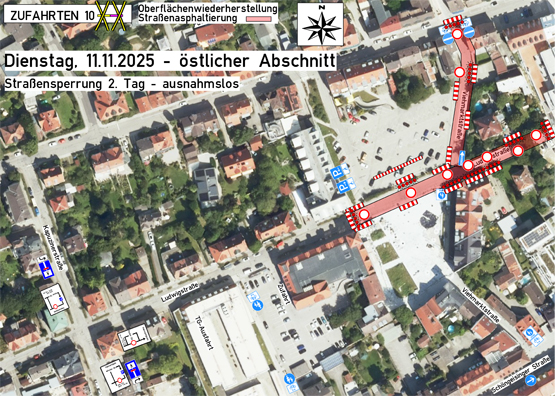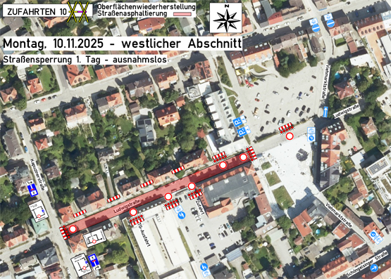Am 10. / 11. November muss die Ludwigstraße wegen Asphaltierungsarbeiten voll gesperrt werden. Los geht es am 10. November im westlichen Abschnitt, tags darauf folgen der östliche Teil und die Viehmarktstraße.