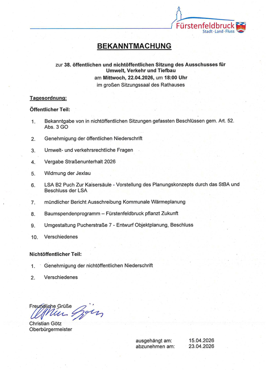 Sitzung des Ausschusses für Umwelt, Verkehr und Tiefbau am 22. April 2026
